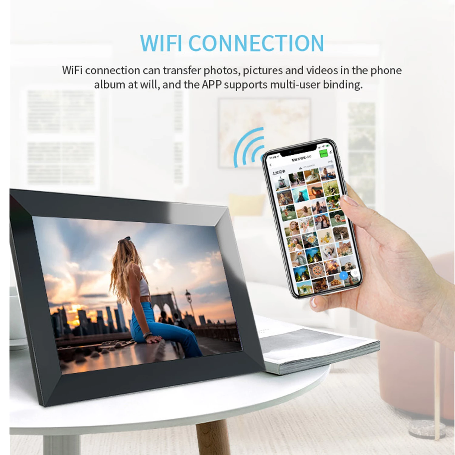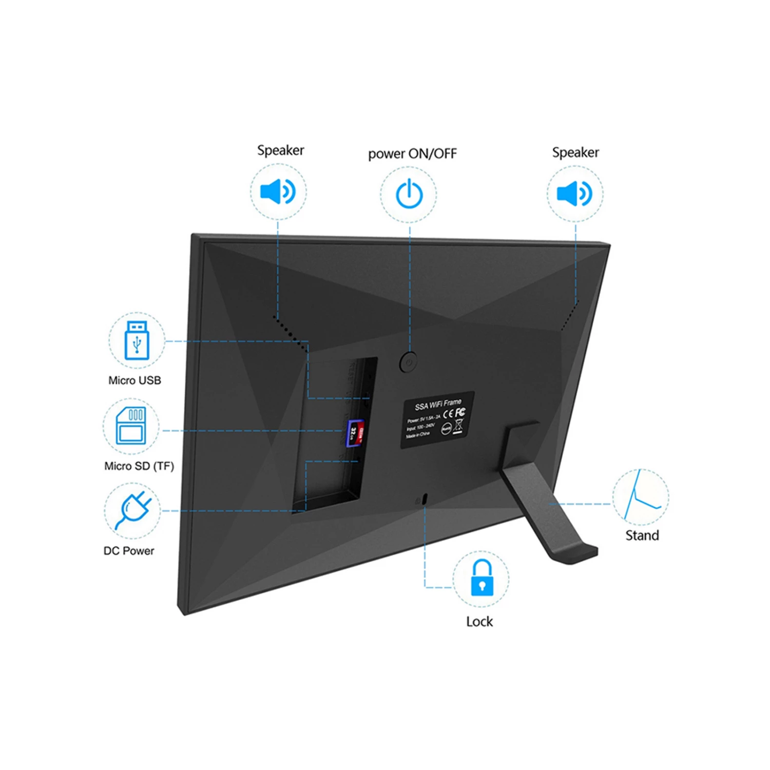 10.1″ LCD ScreenHi Resolution (1920 x 1200)WiFi Connection (via VPhoto APP)16GB Built-in MemoryAndroid System with WiFi FunctionalityMicro USB InputMicro SD Card ReaderBuilt-In Stereo SpeakerPhoto, Video, Music PlaybackJPEG, PNG, MP3, MP4, H.264, AVI File SupportLCD ScreenLCD Panel Size: 10.1″Type: IPS LCDResolutions: 1920 x 1200, 800 x 1280Aspect Ratio: 16:10 WidescreenBrightness: 280-300 cd/m2Viewing Angle: 125 degreeCompatible Image FormatPhoto: JPEG, BMP, GIF, TIF, PNGVideo: AVI, MPEG1/2, MOV, MPEG4, M-JPEG, H.263, H264Music: MP3, WMA, OGG, APE, FLAC, WAVCalendar and Clock: YesPowerDC Input: DC 5V 2AAC Adaptor: 100-240V 50/60HzFunctionsEmail, Cloud Frame: via VPhoto APPWeather: via VPhoto APPAlarm: YesClock: YesCalendar: YesImage Rotation: YesConnectivityWiFi: Yes (VPhoto APP)Micro SD Card: YesMicro USB: YesMemory: 16GBAudio: Stereo Speaker