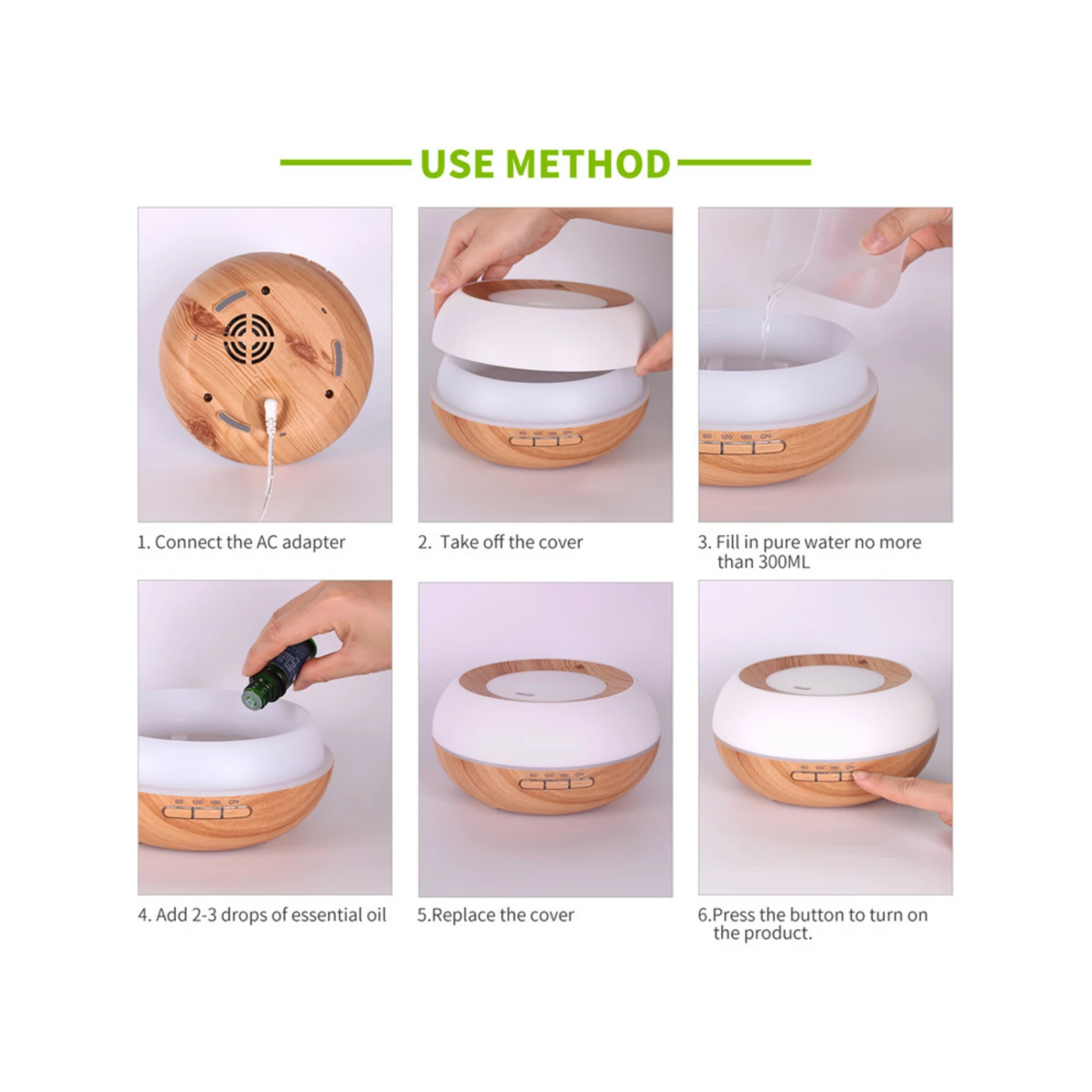 Ultrasonic HumidifierIncludes Essential Oil(Fragrance randomly selected Tea Tree, Ginger Lime, Lotus, Peppermint, Sandalwood, Lavender, Sakura, Jasmine)300ml CapacityUltrasonic Mist7 Colour LED LightIntermittent or Continuous Mist (Hi / Lo) Control30-40ml/h Mist OutputAutomatic Off (Waterless)Stylish Wooden DesignType: Ultrasonic HumidifierVoltage: 110-240V 50/60HzCapacity: 300mlMaterial: PP + ABSTimer: 1 / 2 / 3 hrsMist Mode: Continuous (Hi / Lo), IntermittentLED Light: 7 Colour AdjustableMist Output: 30 – 40 ml/hUltrasonic Vibration: 2.4MHzConsumption: 7WDimensions: 168mm x 168mm x 87mmWeight: 390gPackage Contents: Ultrasonic Humidifier, Power Cable, Manual