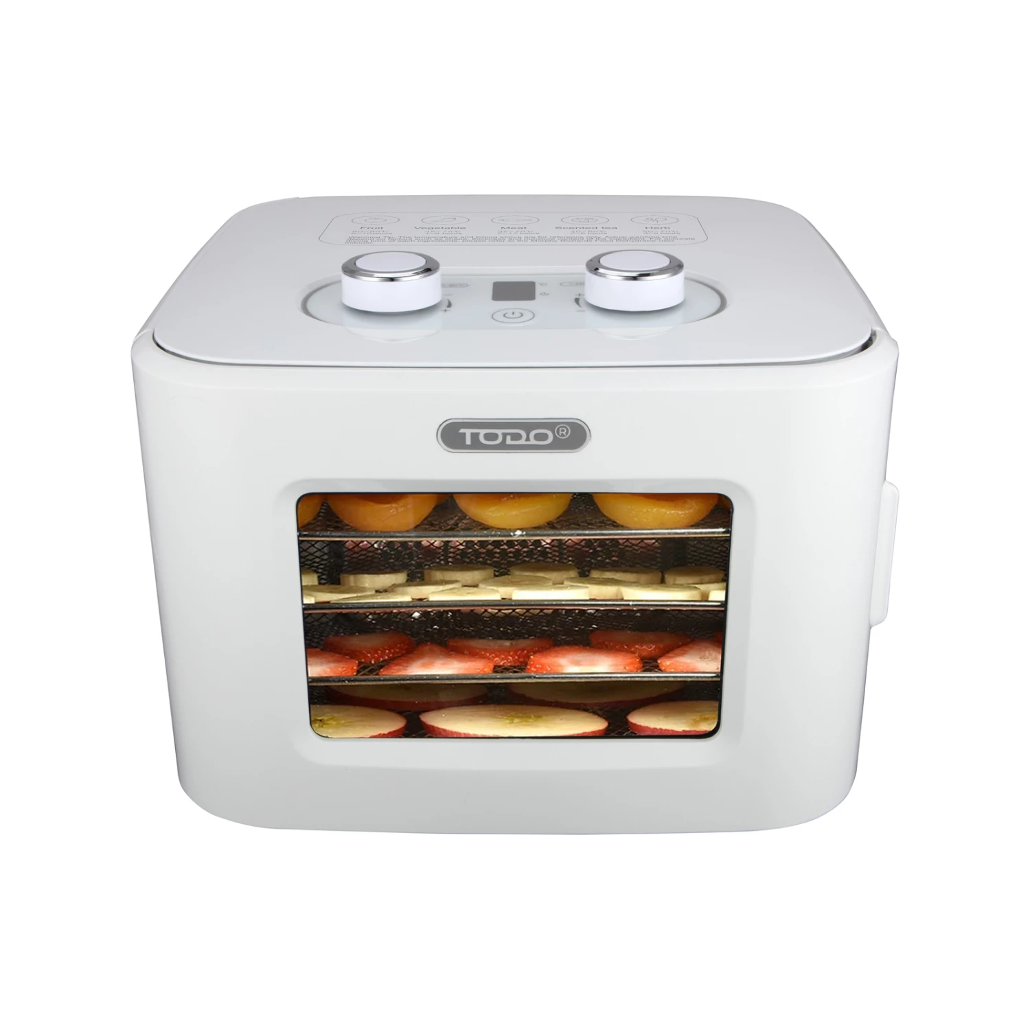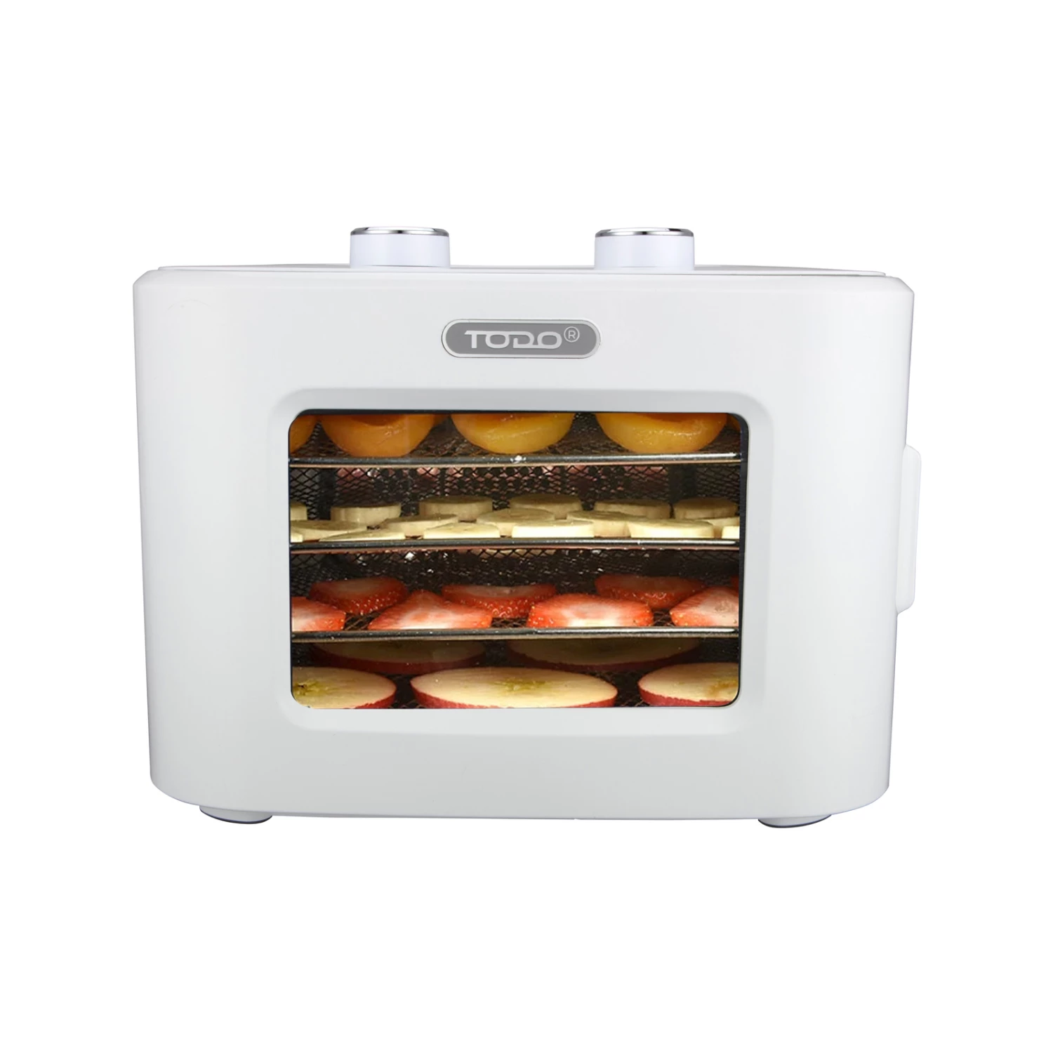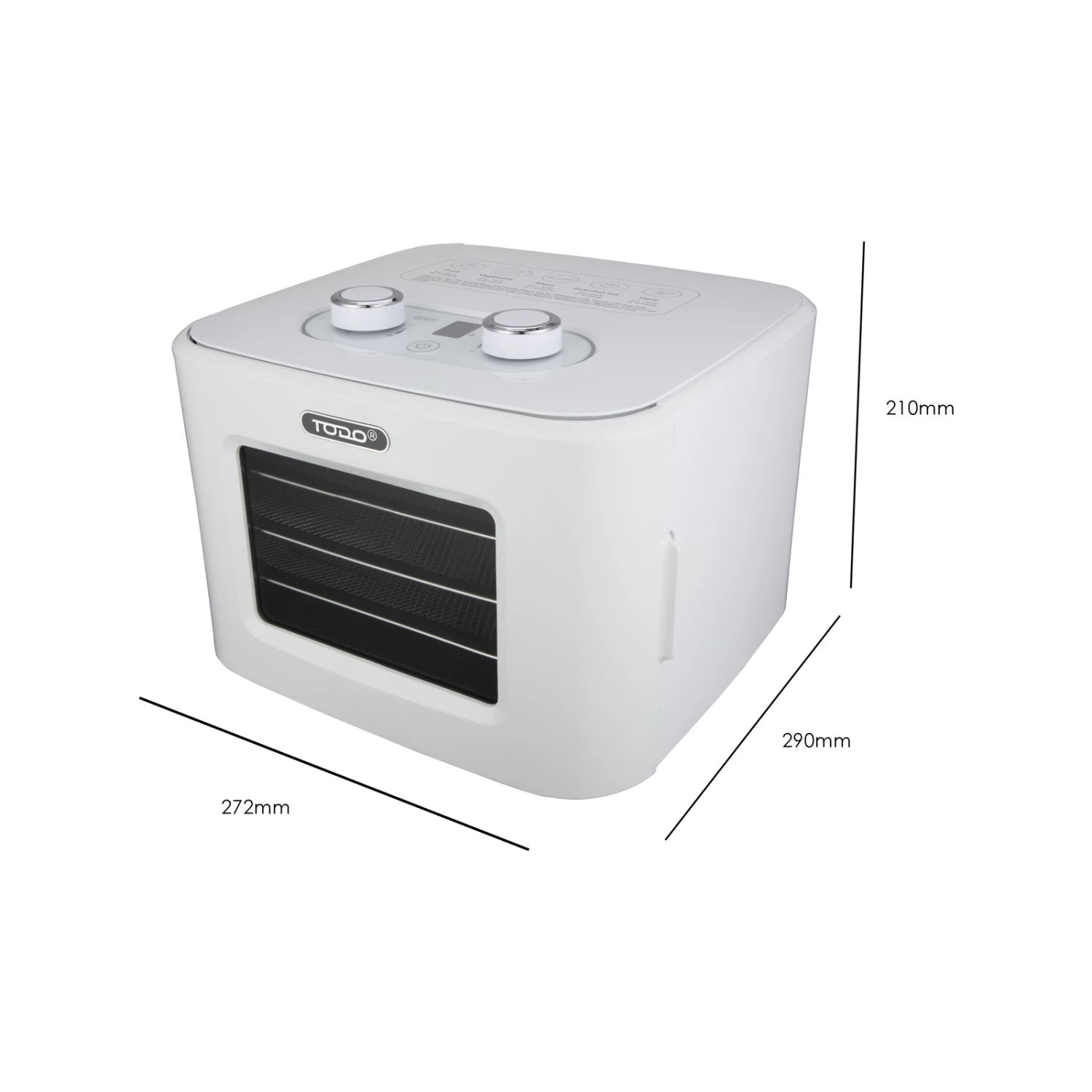 Create delicious healthy snacks with your very own TODO food dehydrator. Be creative with different dried fruits and even flavored meat jerkies. Super quick and easy way to extend the shelf life of your snacks.Adjustable Temperature Setting for Different Foods4x Detachable Stainless Steel TraysDurable Transparent Viewing Window for Easy MonitoringLarge LED Display for Time / TemperatureTime / Temperature Control Dials35°C – 80°C ThermostatEasy to Clean Drip TrayOverheat ProtectionStylish Compact DesignPower: 400WVoltage: 220-240V, 50HzDisplay: Blue Backlit LEDController: Dial ControlSections: 4 LayersThermostat: 35°C – 80°CTimer: 0 – 24 hrs (max.)Overheat Protection: YesPower Button: YesViewing Window: YesDrip Tray: YesDimensions: 272mm x 290mm x 210mmWeight: 2.2kgContents: Main Unit, Drying Rack (x4), Drip Tray, Manual