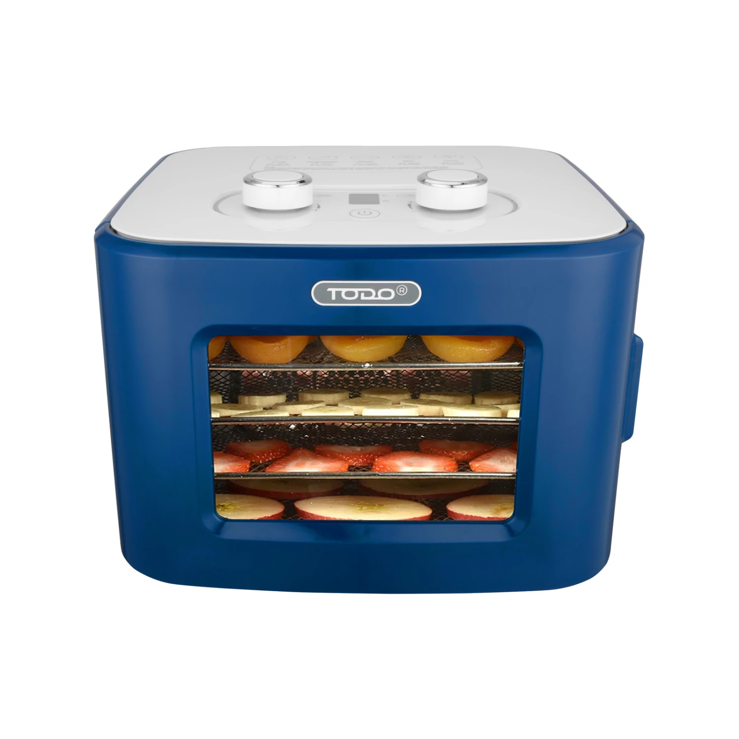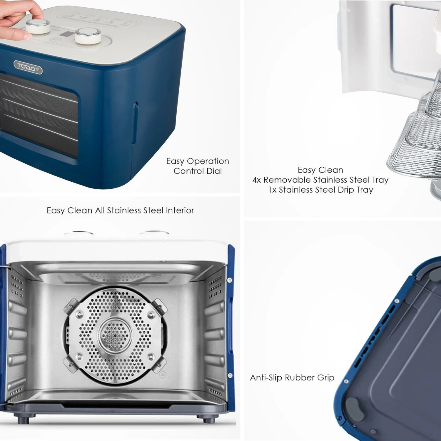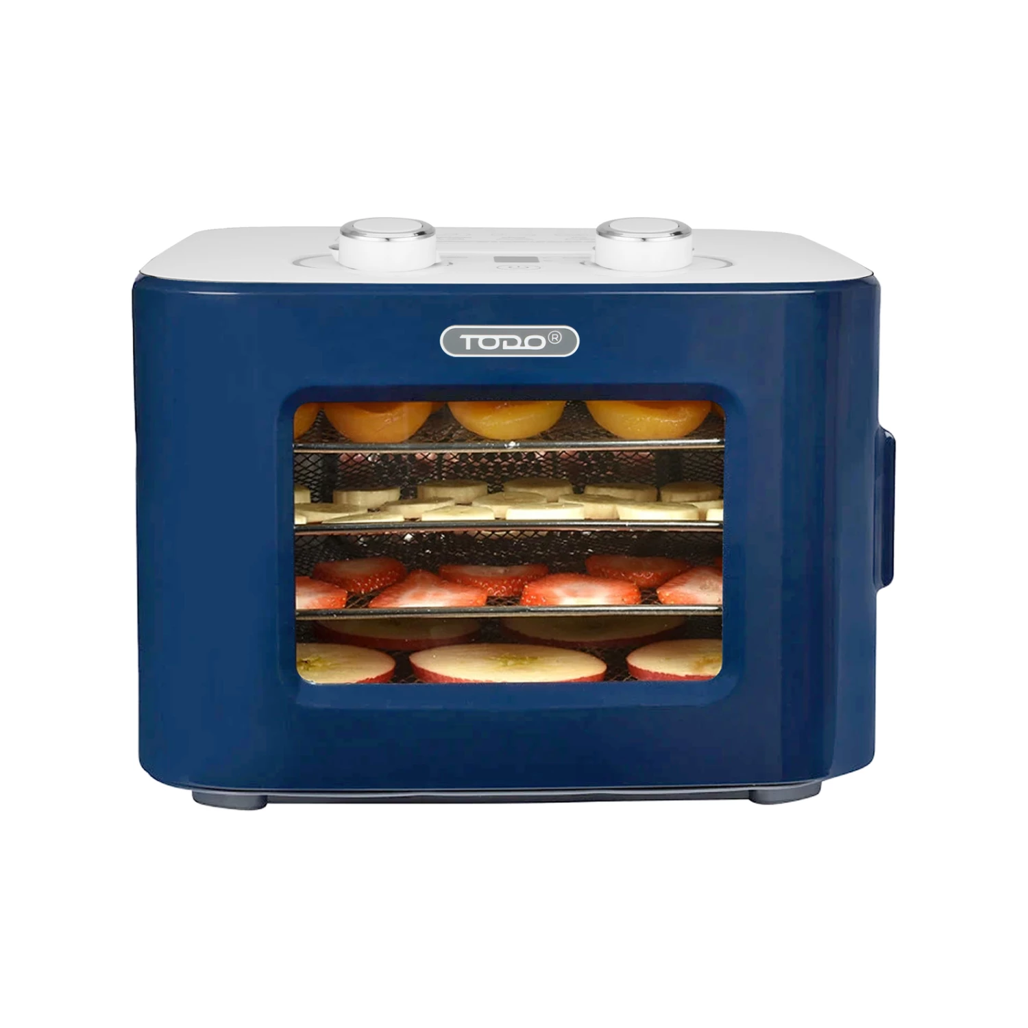 Create delicious healthy snacks with your very own TODO food dehydrator. Be creative with different dried fruits and even flavored meat jerkies. Super quick and easy way to extend the shelf life of your snacks.Adjustable Temperature Setting for Different Foods4x Detachable Stainless Steel TraysDurable Transparent Viewing Window for Easy MonitoringLarge LED Display for Time / TemperatureTime / Temperature Control Dials35°C – 80°C ThermostatEasy to Clean Drip TrayOverheat ProtectionStylish Compact DesignPower: 400WVoltage: 220-240V, 50HzDisplay: Blue Backlit LEDController: Dial ControlSections: 4 LayersThermostat: 35°C – 80°CTimer: 0 – 24 hrs (max.)Overheat Protection: YesPower Button: YesViewing Window: YesDrip Tray: YesDimensions: 272mm x 290mm x 210mmWeight: 2.2kgContents: Main Unit, Drying Rack (x4), Drip Tray, Manual